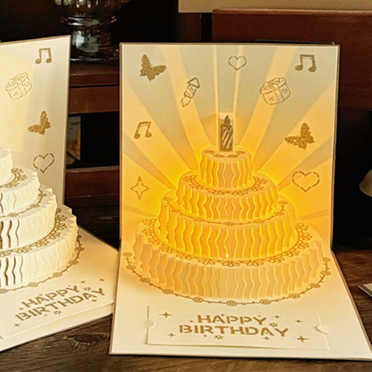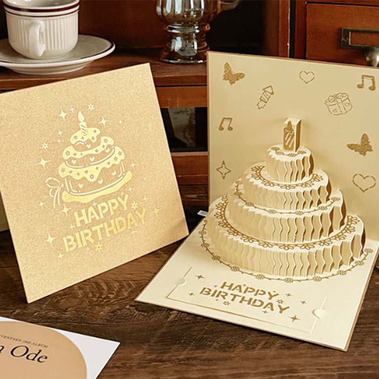 3 ডি জন্মদিনের কার্ডের কভারটি একটি রঙিন এম্বেসিং প্রক্রিয়া দিয়ে তৈরি করা হয়। এর অভ্যন্তরটিতে একটি 4-স্তর কেকের নকশা রয়েছে এবং অভিনন্দন বার্তার জন্য একটি ছোট গ্রিটিং কার্ড যুক্ত করা হয়েছে।