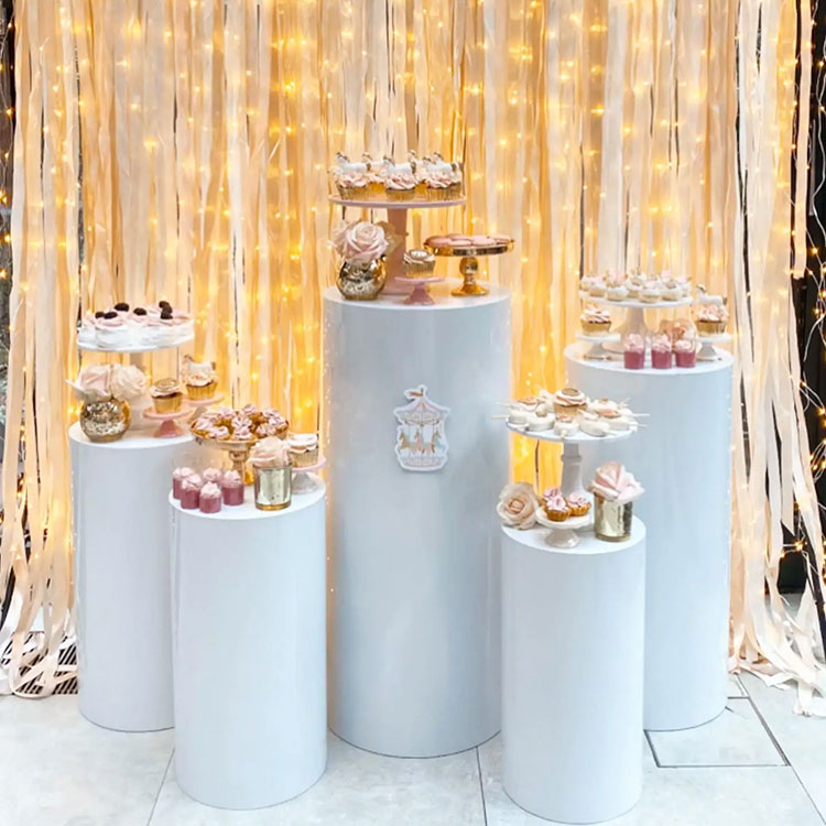 নলাকার বেস ডেজার্ট টেবিলটি একটি ধারক এবং একটি অলঙ্কার হিসাবে উভয়ই কাজ করে। সাধারণত, এগুলি বিভিন্ন সংমিশ্রণে আসে: 3-পিস সংমিশ্রণ, 5-পিস সংমিশ্রণ, 7-পিস সংমিশ্রণ এবং আরও অনেক কিছু। সবচেয়ে সাধারণ সমন্বয় হল পাঁচ টুকরা। বিভিন্ন আকারের স্বাধীন নলাকার টিউবগুলি নমনীয়ভাবে সাজানো যেতে পারে এবং সেগুলি দৃশ্যের একটি গুরুত্বপূর্ণ অংশ। একই সময়ে, আমরা আকার এবং আকৃতির জন্য কাস্টমাইজেশনও অফার করি। আরো কি, তারা আপনার পার্টি সজ্জা মেলে.